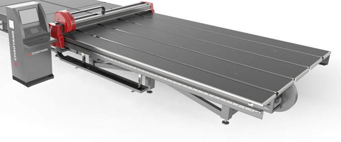 Automatische Glasschneidenmaschine besteht aus Fahrgestellemechanismus, Strahlnmechanismus, Worktablemechanismus, der Trennmessermechanismus und übermittelt Mechanismus, Stellmechanismus des photoelektrischen Scannens und elektrisches Kontrollsystem.